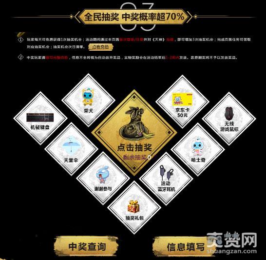 机械键盘、蓝牙运动耳机、京东卡……帮你清空双十二购物车!活动期间内,玩家每天可免费获得1次抽奖机会;通过活动页面首次登陆/注册并对37《烈斩·灭神》充值的玩家,可额外获得3次抽奖机会;完成页面任务也可领取对应抽奖机会。最重要的是,中奖概率超过70%!抽奖机会次日清零。