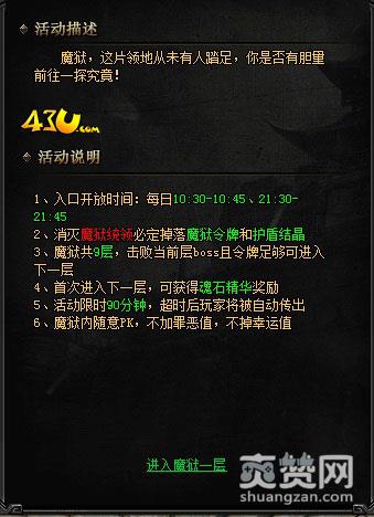 43u《降龙之刃》玩家们角色达到68级就可以参与九层魔狱活动,玩家可在活动入口开放时间前往荣城与NPC魔陨对话进入活动地图。活动时间是每日10:30、21:30,活动时间持续90分钟,每次活动开启前15分钟可进入活动场景,活动时间结束时仍在场景中的玩家将被传送出场景。