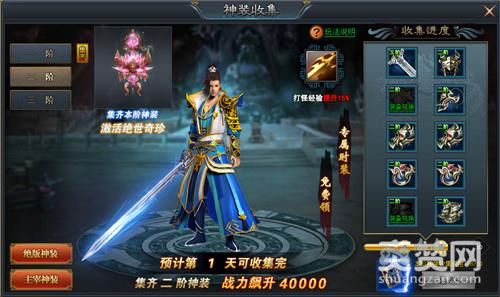 神装的收集有两个阶段,第一阶段是通过完成挑战boss、通天塔等任务来获取神装,第二阶段是回到神装收集的页面将收集到的神装激活,唤醒神装上的神力。当整套的神装被集齐时,主角将会战力飙升,并得到一个特殊的能力,比如提升对普通怪物的伤害或提升秒杀怪物的几率等。