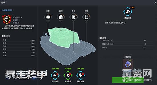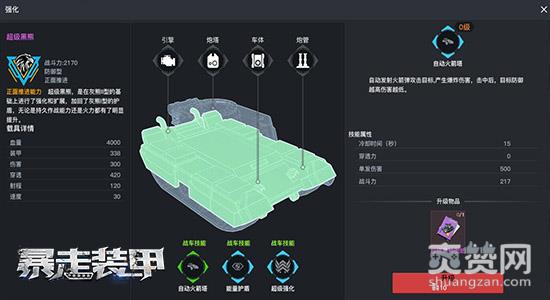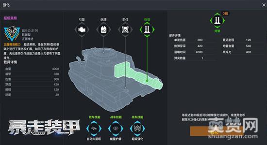 每部装甲共有引擎、炮塔、车体、炮管四个部位可以进行升级。强化要求玩家等级达到20级,部件等级越高所要求的玩家等级也相应提升。对装甲的不同部位升级,所获得的效果也各不相同,所有提升将全部加成到对应装甲的战斗力中。