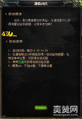 43u《降龙之刃》中的闭关,是对勇者最好的考验,在道馆里可以获得海量经验和威望,当玩家们角色达到60级时即可参与,活动时间是每日14:35-14:55,在活动期间内前往比奇城中与NPC薛竞对话参与活动。