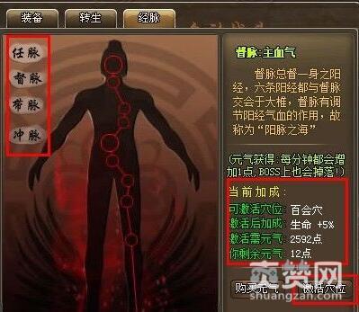 923yx《屠龙传说》的经脉系统中共有四脉,分别是任脉、督脉、带脉和冲脉。每条经脉上都有10个穴位,打通不同的经脉可以激活不同属性。激活穴位需要元气,元气每在线1分钟就会自动增加一点,大家也可以在商城中使用元宝直接购买。