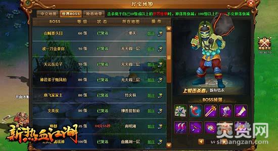 在游戏的打宝地图界面中,可以查看所有世界BOSS的状态信息。BOSS名称、等级、复活状态、所在地图、掉落物品等信息都将一目了然,使用传送功能还可快速前往BOSS的所在地。