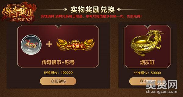 实物奖励有传奇银币、称号或者烟灰缸两种选择,游戏内道具有金砖、元宝、精华等各类奖励,每日限量兑换,先到先得。
