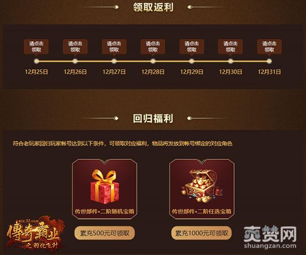 享有老玩家回归白金特权的玩家,绑定角色后(与积分兑换活动绑定一致),活动期间首笔充值可享有海量充值返利,首笔充值100元以上,除当日可立即领取返利外,后续每天仍可领取当日充值获得的返利,最高可连领7天,畅享海量返利。