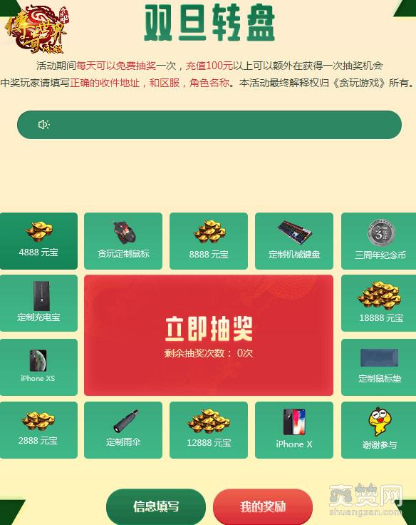 活动期间,每天可以免费转盘一次,充值100元以上可以额外获得一次转盘机会。各位不小心中奖的欧气玩家,请记得要填写正确的收件地址、区服和角色名称,方便收取奖品哦~