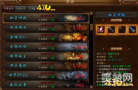 43u《屠龙战神》在玩家们等级达到70级时开启,活动时间是每天的15:00-17:00,在入口开放期间,玩家们可以自行进入珈蓝神殿。