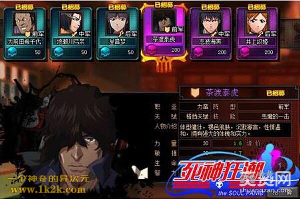 然后就是人物,相信很多动漫迷都想和黑崎一护等人物共同战斗。在1k2k《死神狂潮》不再是幻想。玩家可以在游戏里招募到喜欢的伙伴,不管是英俊潇洒的志波海燕还是甜美可爱的朽木露琪亚等等都是动漫原型,喜欢哪个就招募那个。与他们共同战斗在前进的路上不再独行。