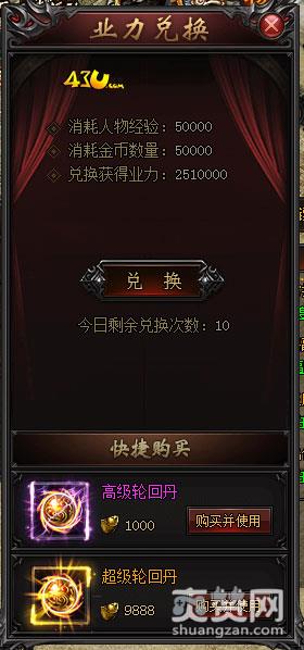 玩家可以消耗金币和人物经验来兑换业力,每日限10次,或者通过快捷购买轮回丹来获得业力,每种轮回丹每日使用次数限制也是10次。