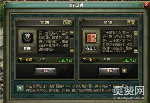 在古代,加官进爵往往是个人能力的完美体现,在33456《热血三国2》自然也不例外。不过这样,王者霸气才能尽显嘛。游戏中官职有等级之分,只有符合一定的等级和条件才能做官,官职由低到高,依次为平民、伍长、什长、 里魁、亭长、啬夫、县长、县令、督邮、太守、别驾、刺史、州牧、丞相、皇 帝。路漫漫其修远兮,吾将上下而求索。相比屈原的艰苦,我们似乎要庆幸很 多。看似漫漫升官路,其实只要你和小编一样,一步一个脚印,不断提升个人 等级,不断增加自身资源,称霸天下完全不在话下哦!