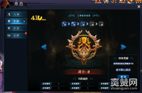 首先是43u《虎啸龙吟》军阶系统,当玩家们挑战成功一层军阶试炼,就可以升级一 级军阶称号,同时带来属性的加成,试炼层数越高难度越大,军阶提供的战力加成 越多。