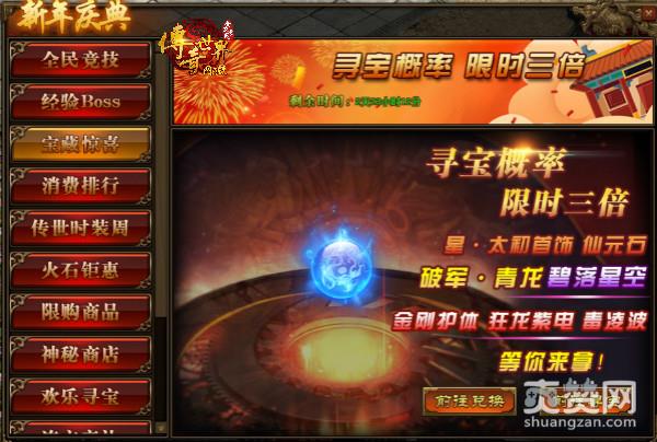 活动期间玩家寻宝概率翻倍,极高几率获得星太初首饰,仙元石、碧落星空,神力特戒钢纹,传世灵器、传世灵甲,高级天魂石以及4级天魂石宝藏大放送,惊喜连连看,今天最后一天!祝大家好运!