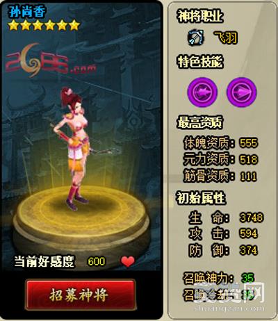 相对来说,孙尚香的获取几率还是比较高的,如果玩家不打算靠活动神将来通关的话,也可以选择招募孙尚香并培养,毕竟蓝将中孙尚香的杀伤力还是比较惊人的。