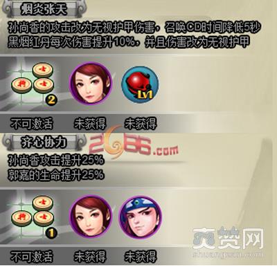 孙尚香与郭嘉或黑烟红丹同时上阵,可开启自身的神将潜能。与郭嘉时,开启的是“齐心协力”的潜能,可提升自身攻击;与黑烟红丹时,开启的是“烟炎张天”的潜能,可使自身普攻转变为破甲攻击,大大提高杀伤力。