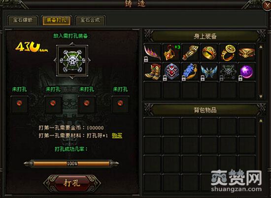 其次是装备打孔,想要给装备镶嵌宝石,装备上必须具有插孔。除部分低级装备外,大部分装备可以通过装备打孔功能增加插孔数量。每次打孔需要消耗打孔符以及绑定金币。为装备打孔有一定的成功几率,装备已有的孔数越多,打孔成功率越低。一件装备最多可拥有4个宝石插孔。