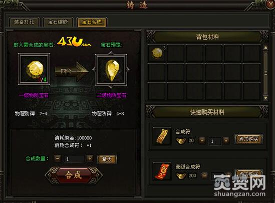 43u《铁血皇城》超变版铸造系统由宝石镶嵌、装备打孔、宝石合成三个部分组成。首先是宝石镶嵌,将宝石镶嵌在带有插孔的装备上,可以提升该装备的某种属性。选择你要镶嵌宝石的装备,再选择你所要镶嵌的宝石。每个插孔均可放入一颗宝石。有多个插孔的装备上同种属性的宝石最多可镶嵌1颗。确认后点击镶嵌按钮即可完成镶嵌操作,每镶嵌1颗宝石需要消耗100000金币。