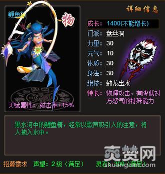 鲤鱼精,是黑水河出身的蓝色品质神将,其天赋为破击,攻击类型是物理攻击,特长是降低对方怒气。虽然它只是低品质神将,但破击天赋在战斗中很有优势,且又有降低怒气的能力,因此非常适合低等级的玩家使用。