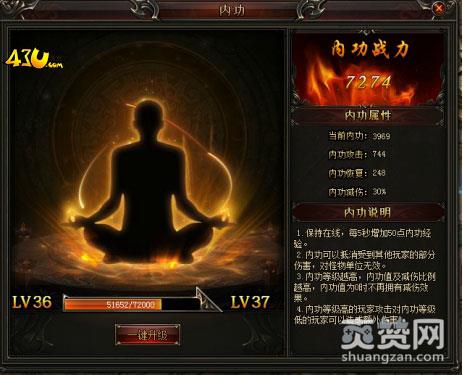 43u《战神风云》玩家们等级达到2级就能开启内功系统,可以根据其内功值来升级内功等级,内功可抵消受到玩家的伤害,对怪物无效。玩家内功的等级越高,减少伤害的比例和内功值总量越高。受到玩家伤害会减少内功值,当内功值为0时不再失去减伤效果。内功等级高的玩家对内功等级低的玩家可以造成额外的伤害。