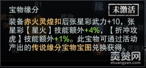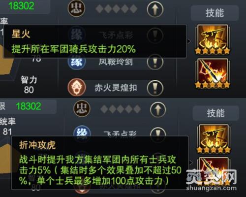 张星彩的一大亮点就在于她强力的技能,单从数据就能看出她不愧为一名神将。她的第一个技能“星火”能提升所在军团骑兵的攻击力20%,即使是有“西凉铁骑”之称的马超也只对特殊骑兵加成20%,而张星彩则是对普通骑兵都有20%的攻击加成,超过了所有骑兵神将。她的第二个技能“折冲攻虎”还能在战斗时提升我方集结军团内所有士兵5%的攻击力,在集结时多个效果叠加最多可为集结军团增加50%的攻击力,堪称骑兵队的攻坚利器。此外,如果为张星彩装备赤火灵煌扣,还能增加其10点武力值,她的“星火”技能获得4%加成,“折冲攻虎”技能获得1%加成,这对她的整体实力又是一大提升。