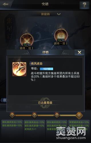 再看张星彩的突破。四阶突破完成后,可增强部队骑兵15%的攻击和防御,10%的穿透、连击、抵抗和护盾,还可增强所在军团骑兵10%的攻击和防御。在突破第三阶段,张星彩的技能也会得到提升。其“星火”技能将再增加10%的效果,达到对自身军团30%的加成;同时会为“折冲攻虎”增加5%的效果,如果拥有5个突破三阶段的张星彩就能叠加到满状态的集结加成,非常强力。同时,她的突破技能“疾风虎劲”可以提高集结军团内所有士兵20%的连击,只要对面抵抗不变,那就相当于增强了20%的攻击力。如此强大的攻击增益,无论是主修或辅修骑兵的主公都十分值得将其纳入麾下。