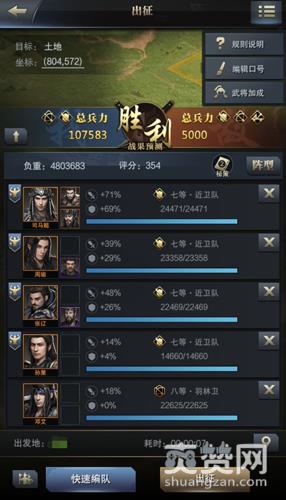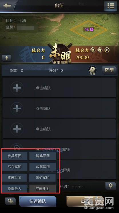 除此之外,游戏中还有其他功能性的快速编队。如按照兵种进行军团编队,建设军团编队,采矿、负重编队,以及空位补全。在这四种兵种的快速编队中,武将的编入和普通快速编队规则一样,而兵种编入则按照你所选的兵种全部编入,不论该兵种的数量是否足够。同时,建设军团这个功能用于建设城寨、分城等建筑,快速编队时系统只会派出一个最高统率的武将,先锋谋士一般情况下并不会编入,且只派出一个部队,但如果主公麾下有刘表和许褚这类拥有加快分城和城寨建造速度技能的武将,系统就会将他们作为先锋或者谋士编入队伍中。