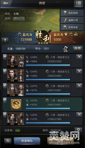 在各位主公出征的队伍编辑界面中,最为常用的快速编队是在所拥有的武将中,带兵数最高的武将作为主帅,武力值和技能加成总和最高的武将作为先锋,智力值和技能加成总和最高的作为谋士,三个位置的队伍编入优先级依次下降。一键编队多用于进攻战力远低于自身的野战,不需进行针对性的排兵布阵,直接快速高效的战力碾压获胜,是十分常用的功能。