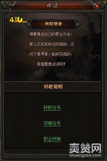 首先是一转,43u《战神风云》玩家们进入游戏时为无职业,通过主线任务的一转来进行转职,选择自己喜欢的职业。每个职业都有其对应的技能和特性,注意转职只能选择一次,确认后不可更改哦!