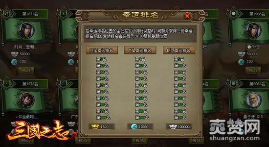 每日竞技场中都会刷新一次幸运排名,幸运排名分为元宝幸运排名、声望幸运排名及银两幸运排名。每种排名中有10位玩家可以获得对应的幸运奖励。