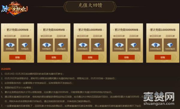 2019年1月14日-1月28日开启老玩家回归活动。玩家账号满足2018年12月31日之前登录过,2019年01月01日-2019年01月14日期间没有登录过,并且曾经充值过任意金额的钻石,即可选择回归。回归玩家使用召回码回归后满足登录和充值条件,你和他都可以获得情义值奖励。情义值可以兑换丰厚礼包,或用于抽奖赢取极品大礼!每个账号最多可以召回10个朋友哦~