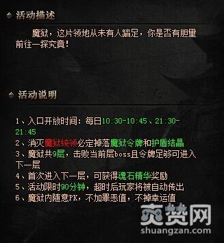 923yx《霸王之心》中的魔狱只有在每日的10:30和21:30可以进入,每次只能呆90分钟。魔狱中共有九层,大家进入后将从第一层开始挑战,在收集到足够的魔狱令牌后可即可与传送员对话前往下一层地图,层数越高,需要提交的魔狱令牌就越多。