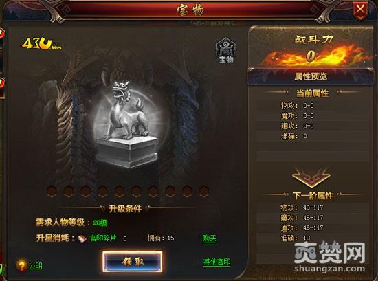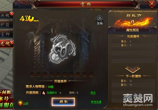 43u《猛将天下》中玩家们达到相应等级后,获取材料便可以激活相应的宝物。宝物有4种,分别是提升玩家生命上限的血魄;提升玩家物理防御和魔法防御和暴击伤害减免的护符;提升玩家攻击和命中的官印;提升玩家暴击和暴击伤害的龙魂。