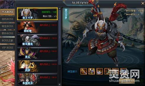 在923yx《武动苍穹》的挑战BOSS中,共有六种BOSS玩法,分别是个人BOSS、VIP BOSS、野外BOSS、转生BOSS、挂机BOSS以及BOSS之家。其中,个人BOSS只供大家单人挑战,VIP BOSS需要是VIP用户才能挑战,转生BOSS则要求大家转生后方能挑战。