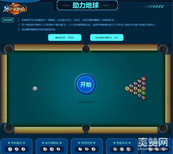 1月28日-2月3日活动期间,玩家每天可以免费进行一场游戏,充值100、500、1000元都会赠送一次游戏机会。1-12号球每个价值分1积分。12个球全部打进之后,13-15号球每进一个球可以获得10积分。活动期间积分前十的玩家都有奖励哦!