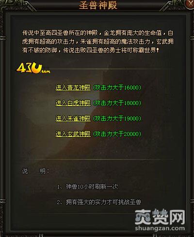 43u《铁血皇城》超变版圣兽神殿一共分为青龙、白虎、朱雀、玄武四大神殿,神兽10小时刷新一次,击杀将有机会获得元宝、999朵玫瑰花、超级转生丹、特戒碎片包、超级灵力丹等极品道具,boss极其强大,必须要有强大实力才可前往挑战!
