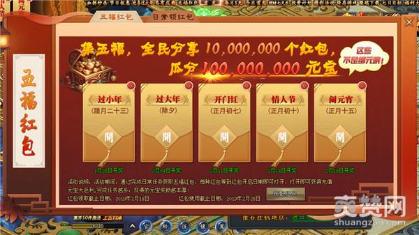 三界迎新春,五福送好礼,360uu《武动苍穹》五福红包来袭,开红包领惊喜,一起瓜分一个亿,全新五福活动来袭,目前在游戏中只需完成日常任务即可获取五福红包,在规定日期到达后即可开启红包,领取充值元宝大返利,这一次的奖励不是绑元,而是真真正正的元宝!目前共有小年、大年、开门红、情人节与元宵节五个红包等你来拿,上线闯三界轻松领红包,在新春佳节到来之际,领取这个新年送给你的第一份惊喜!