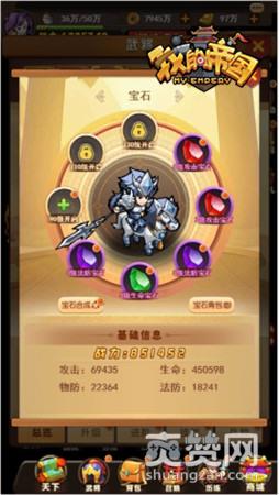 在37《我的帝国》中,还有宝石系统可让玩家提升战力,它们分别为:攻击宝石、物防宝石、法防宝石和生命宝石四种。等级由1级上升到10级,等级越高,属性越强。消耗四个同等级的宝石可以合成高一等级的宝石,若将宝石佩戴在武将身上,还可提高武将的对应属性。