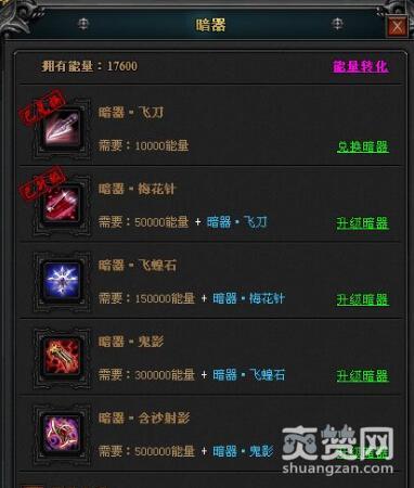 923yx《七杀》中的暗器系统依赖于杀神属性系统,只有杀神系统达到了名动一阶,大家才能使用能量来兑换一级的暗器。之后若想提升暗器,只需要花费一定量的能量值就可以,能量值可以使用人物的等级经验来兑换。
