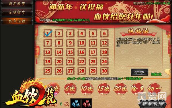 打BOSS掉金猪,这活儿累了点,为此《血饮传说》春节狂欢特地为大家准备了躺着都能拿奖励,点个祝福就可换豪礼的福利。游戏中,玩家只要在特定时间内,为游戏送上祝福就能够在达到特定次数后获得对应的奖励。舒服!