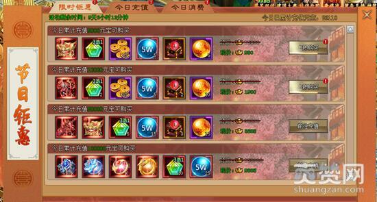 元宝翻牌:当日每充值到一定的元宝数额后,即可获得一次开红包的机会,开到多少就可以获得多少充值元宝奖励!并且该翻开过的奖励档次同一轮翻牌中将不会再被翻中,活动每日0点或者一轮开红包结束后重置!