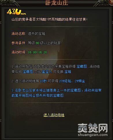 43u《铁血皇城》超变版中玩家们等级角色达到80级即可参与“遗失的宝藏”活动,活动开启时间为每天的16:00-16:20,玩家可通过铁血土城NPC“卧龙山庄”进入。