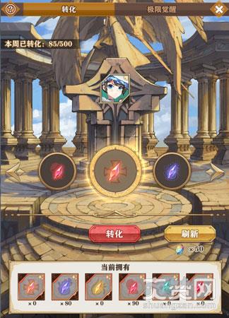 而极限觉醒宝石共有9种,不同英雄极限觉醒时均有对应所需的宝石,觉醒宝石的获取方法有三种,第一种方法即“转化”,通过任意英雄(不论星级)的英雄之证,均可以通过转化功能以1:2的比例转化为宝石碎片,转化每次提供3种宝石碎片可供转化,可以通过刷新来选择其他不同的宝石碎片,每周设有转化英雄之证的上限,每周一刷新,100个宝石碎片可用于合成对应的极限觉醒宝石;第二种方法则是可以在商店中消耗英雄纹章来购买宝石礼包,每周设有购买上限,同时每周一刷新;第三种获取方法则是通过分解英雄之证也可以以1:1的比例获得对应的宝石碎片,宝石碎片可合成极限觉醒宝石。