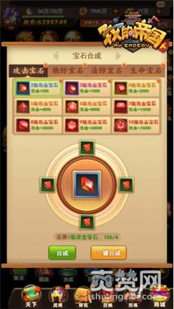 37《我的帝国》内宝石分为攻击宝石、物防宝石、法防宝石和生命宝石四种。宝石等级由1级上升到10级,等级越高,属性越强,消耗四个同等级的宝石,可以合成高一等级的宝石,宝石可以佩戴在武将身上,并同时提高武将的对应属性。