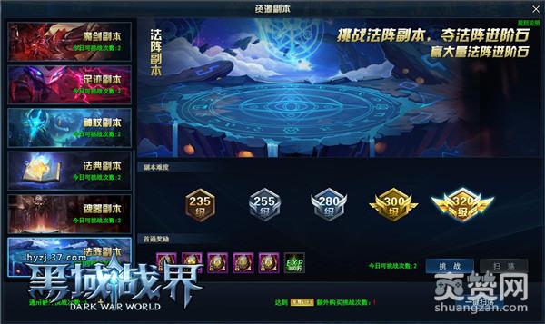 在37《黑域战界》中,玩家需要到达235级,才能开启法阵系统,此外,使用对应的法阵进阶石,可升阶法阵,等阶越高,属性越高。法阵资源副本可产出法阵进阶石,越高等级的法阵资源副本,产出的进阶石种类越多。