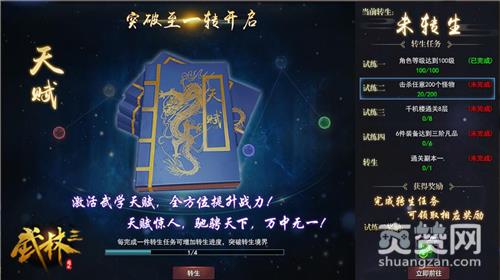 初入江湖的凡夫俗子,仰望着大神们登萍渡水、踏雪无痕的身姿,还有那快如闪电的刀剑在风中尽情挥舞,不时就会流露出一丝羡慕的神情,毕竟百级之后便不再是平凡的自己。在《武林三》里,当玩家角色等级角色达到100级且完成主线任务后就会经历一次全新的洗礼——转生系统开启。转生系统可以帮助角色再一次进化,进入转生面板后可以看到几项信息,首先是转生任务,需要完成四重试炼以及转生副本才可达成一转。完成突破后,还可获得该阶段的转生奖励哦!