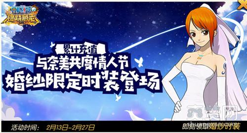 为了庆祝情人节,《航海王:燃烧意志》在游戏中推出了娜美情人节限定时装,身着洁白婚纱的娜美面带微笑款款向你走来,久等了,欧尼桑!这样如梦如幻的场景,在《航海王:燃烧意志》中参与活动就能看到啦,赶快登录游戏,把你全部的爱交给小贼猫娜美吧!