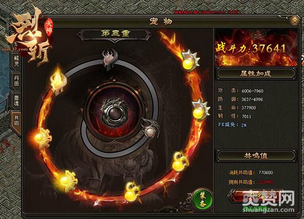 兽神祭坛内挑战鲲王之王,必定获得共鸣装备,集齐一套共鸣装备可激活特殊能力“天人合一”,开启宠物合体功能!共鸣装备PK不掉落、允许交易。