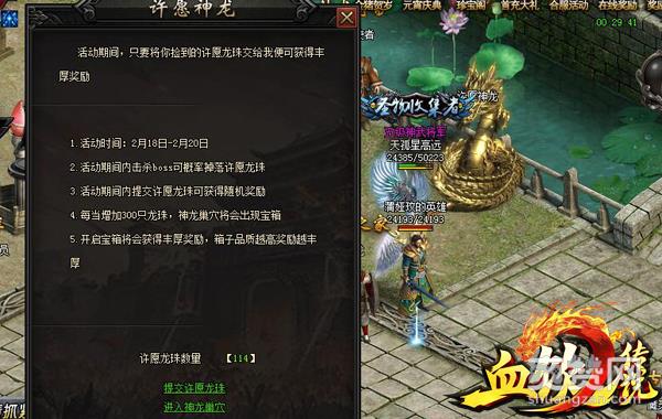 随着元宵节临近,哥们网《血饮传说》也应景的推出了相应的活动,其中就有“元宵祈福”这一项。活动中,我们可以通过打BOSS获得许愿龙珠,龙珠可以去向神龙许愿,每当许愿龙珠增加300只时,神龙巢穴将出现宝箱,包厢里面有超多好东西。从这个样子来看,元宵祈福是一个只赚不赔的活动,但是很多玩家就困惑了,向神龙许愿?神龙在哪里?