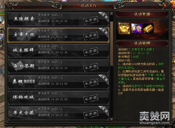 主宰无双跨服战开启,360uu《战神风云》每天准时开启,一场横跨数个服务器的乱斗角逐等待你来加入,每天11点半入口开启,只需90级即可进去同台竞技,在活动的前10分钟报名开始,玩家们可在这个时间段内进入战场耐心等待。时间一到战斗正式拉开帷幕,在这个场景相当于主城大小的地图内,玩家们可以尽情自由PK,这里没有兄弟朋友,所有人都将是你的对手,真正的乱斗,谁能在这场跨服厮杀真活到最后,才是今天真正的战神!