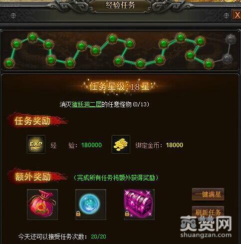 当大家在923yx《战天》中达到50级之后就可以领取经验任务了,点击屏幕右边“任务追踪”栏的“经验任务”就会出现任务界面,点击接受任务即可。经验任务还有星级之分,点击任务界面的“刷新任务”按钮即可刷新任务。任务星级越高,可以获得的经验奖励就越多。