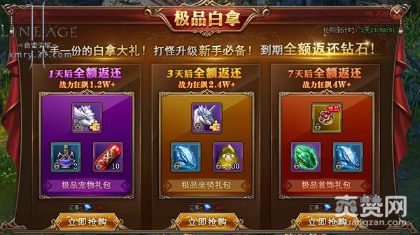 星座服上线后,全新的七日登录活动也将同步上线。活动期间内,玩家每天登录都可领取对应的七日登录奖励。累计登录七天,即可获得包括专属称号、超强宠物在内的所有极品奖励。更有极品白拿活动,购买即可获得相应奖励,到期全额返还钻石,不花一分钱即可获得,心动不如马上行动!
